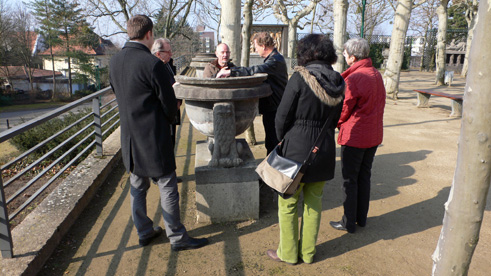 Am 09.03.2012 fand eine Besprechung über die Restaurierung der Hoetger-Skulpturen im Platanenhain statt. Teilnehmer (auf dem Foto von links nach rechts) waren u. a. Philipp Gutbrod, Institut Mathildenhöhe, Nikolaus Heiss, Koordinator Mathildenhöhe, Hans Michael Hangleiter, Restaurator, Hans Gerhard Knöll, Vorsitzender der "Freunde der Mathildenhöhe", Renate Charlotte Hoffmann und Christiane Knöchel sowie - nicht auf dem Foto - Schrosch Wolf und Claus Dieter Knöchel. Unser Verein wird in diesem Jahr zwei Vasen sanieren lassen. Näheres dazu unter "Projekte/Sanierung der Hoetger-Skulpturen". (09.03.2012)