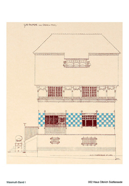 Das historische Olbrich-Haus ziert, wie auf alten Fotos zu erkennen ist, ein Fliesen-Spiegel, der um das gesamte Haus bis in die Fenster- und Türöffnungen gezogen war. Einen Eindruck vermitteln die hier hinterlegten Bilder.