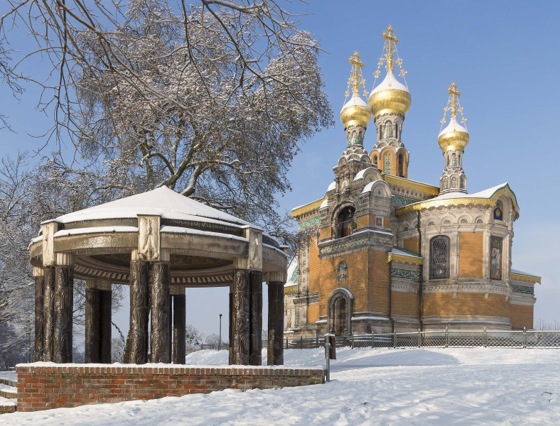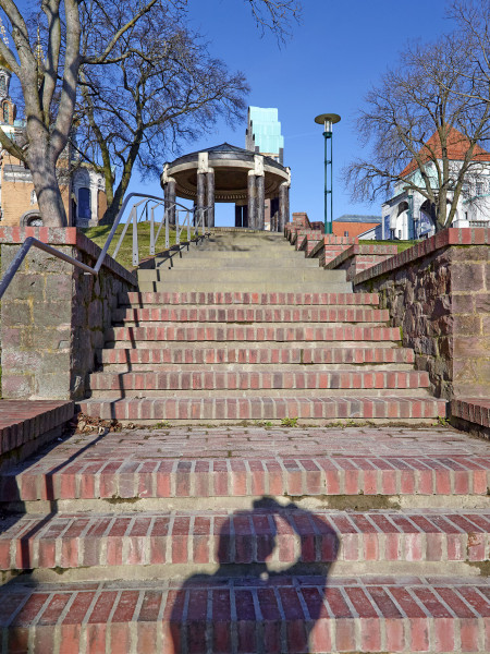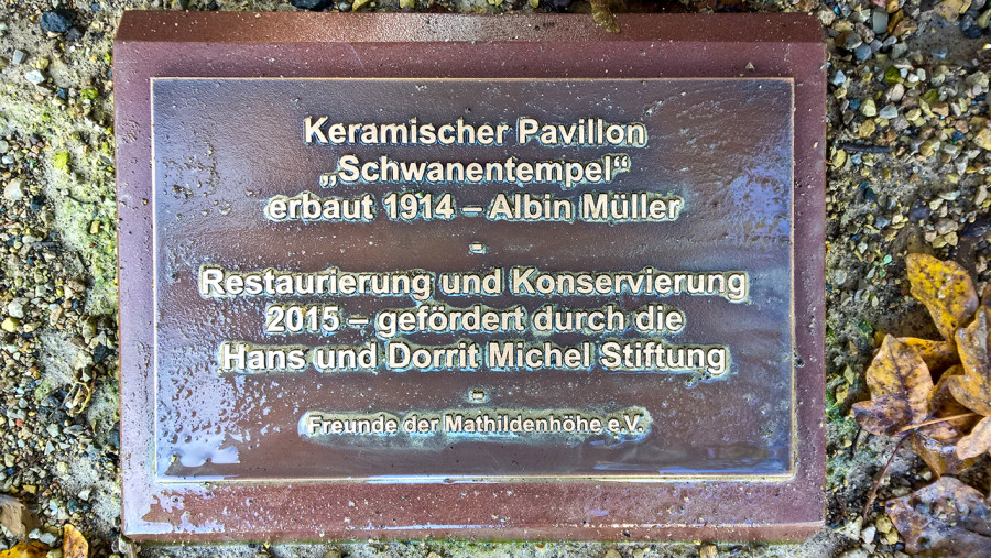 Im Jahr 2014 wird der Keramische Pavillon, der wegen der Motive im Dachbereich allgemein "Schwanentempel" genannt wird, 100 Jahre alt. Albin Müller hat ihn 1914 entworfen und an einer herausragenden Stelle oberhalb des Scheitelpunktes des Alexandrawegs platziert, von wo er über die Stufen des Christiansenwegs unmittelbar zu erreichen ist. Dort steht er am höchsten Punkt, von wo aus sich verschiedene, besondere Sichten auf die Künstlerkolonie öffnen.
