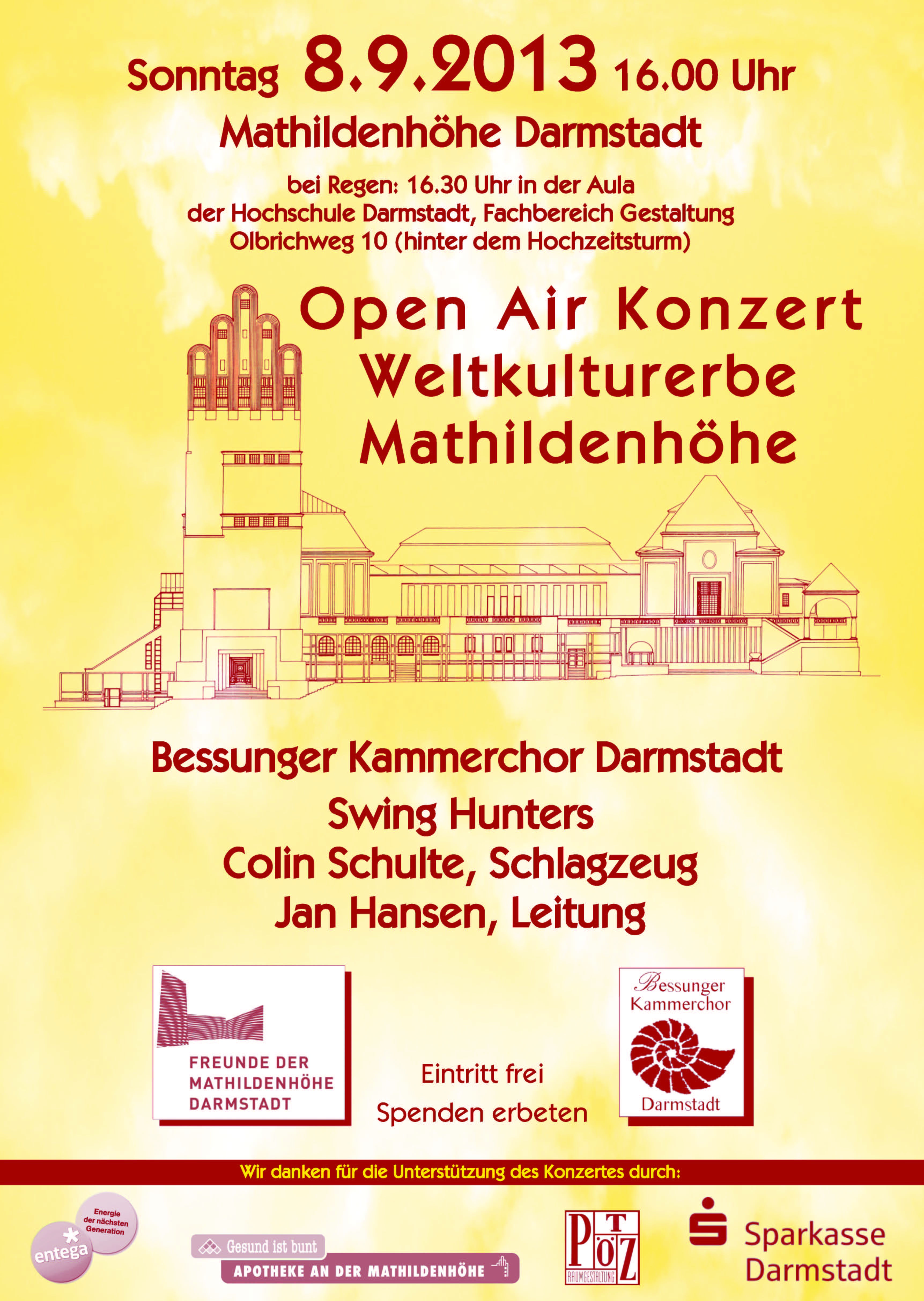 Wegen des Wetters findet das Konzert ab 16:30 Uhr in der Aula des Fachbereichs Gestaltung der Hochschule Darmstadt (auf der Ostseite der Mathildenhöhe) statt.